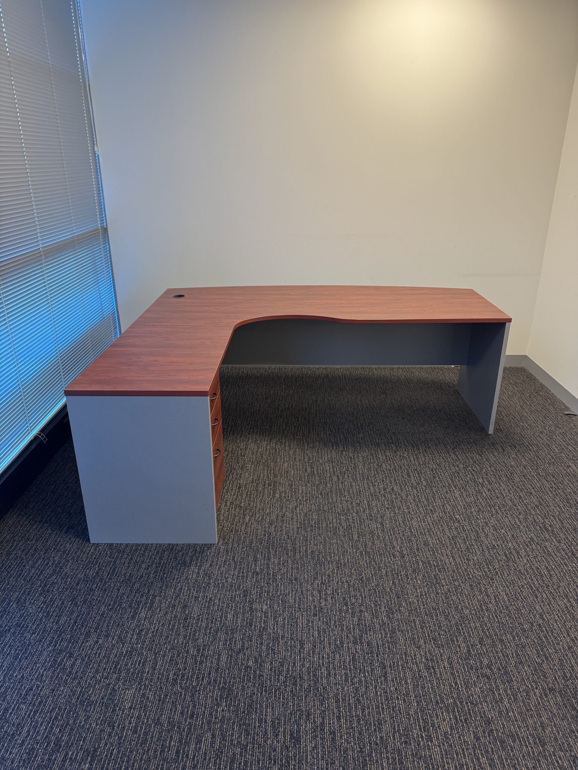 Enhance your workspace with this modern and professional executive corner workstation, designed with a curved front for added style and comfort. Featuring a rich jarrah timber finish complemented by brushed silver accents, it offers both sophistication and practicality for any office environment.