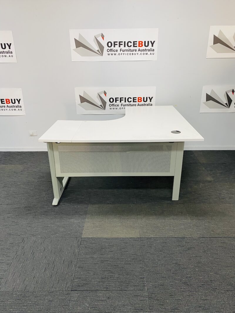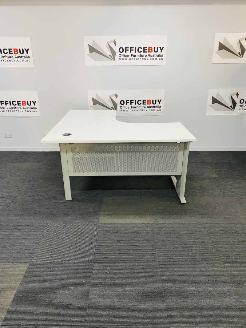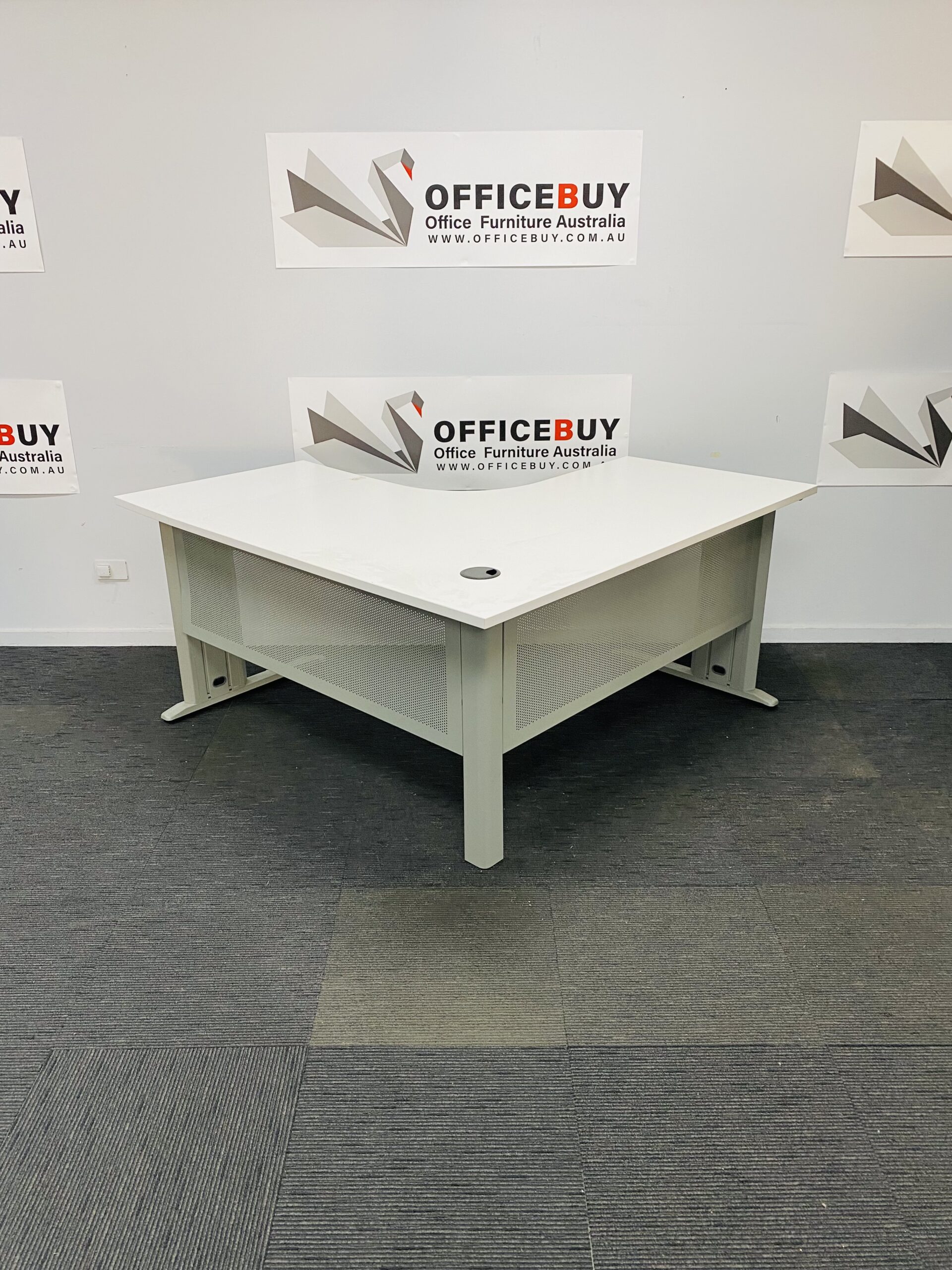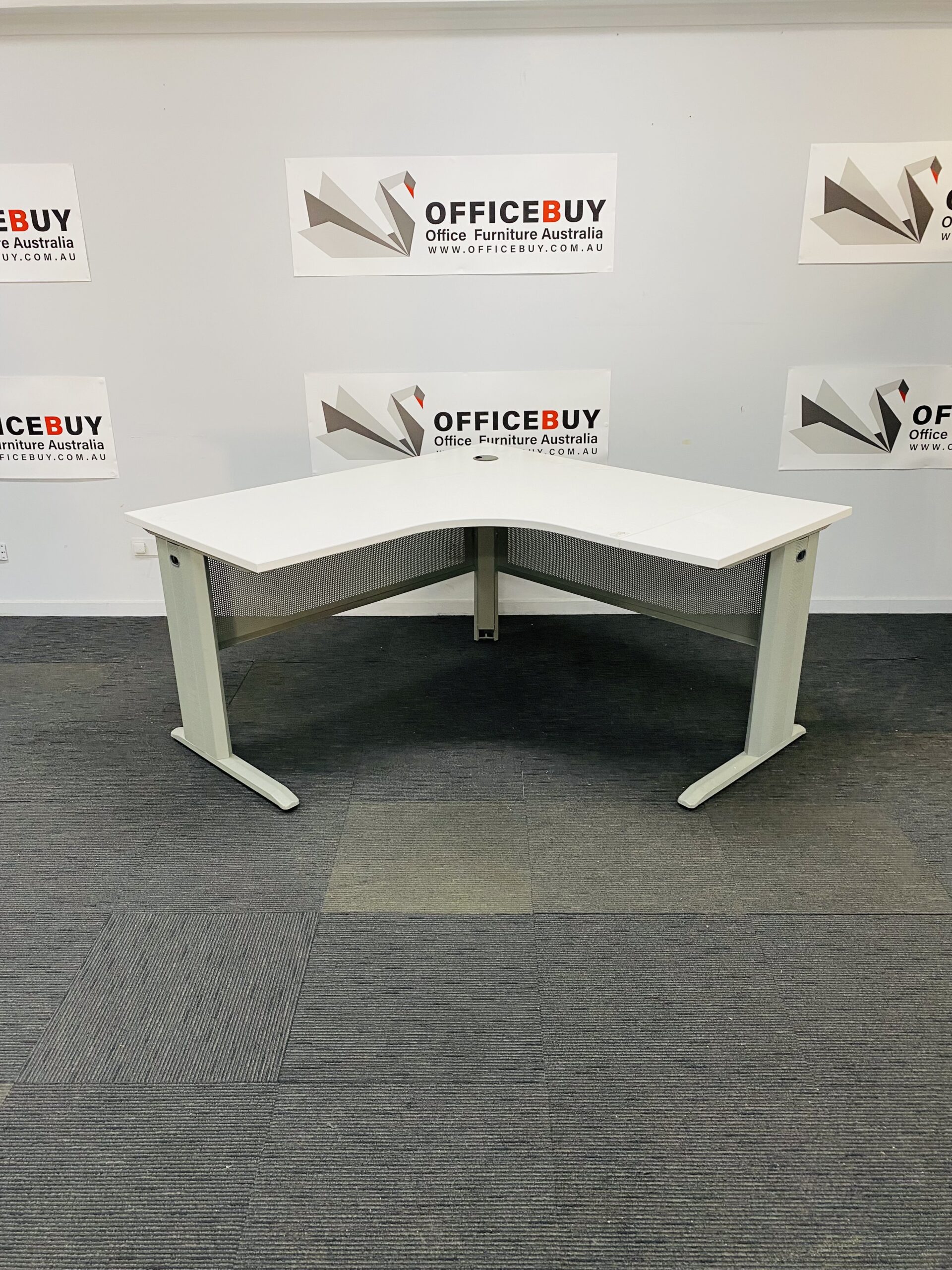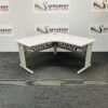 Create a functional and stylish workspace with this one-piece top corner workstation! In second-hand but good condition, this white desk features a durable timber top, a sleek curved design, and sturdy metal legs. Ideal for office or home office environments.